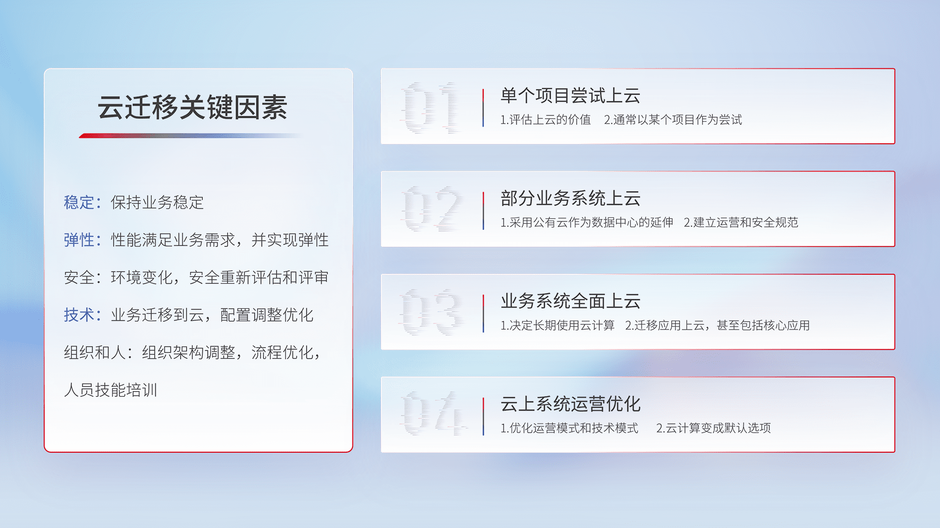结合实际业务,,从规划设计、、、、云平台选型、、云原生改造、、、数据迁移、、集成交付,,,迁移全过程为客户识别最佳上云路径,,做好风险识别管理,,,,设计网络架构、、、、身份权限、、安全审计合规、、、、操作审计、、、日志审计、、监控告警策略、、、多站点容灾设计等,,,对云上基础设施进行整体规划,,提升IT治理水平,,,以满足弹性、、、高可用、、、、高性能的需求。。。